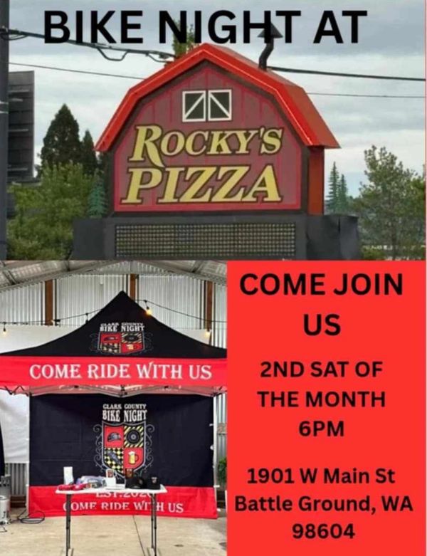 Join Clark County Bike Night on the second Saturday of each month at Rocky's Pizza in Battleground WA. Family friendly and a great way to hear more about what CCBN is doing in the community, inquire about participation, and helping to support a local business. Whether you have a motorcycle or not...all are welcome.